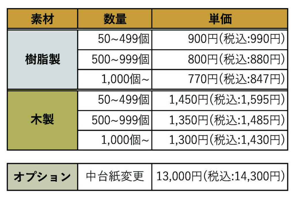 ※料金表にピンバッジ価格は含まれておりません。